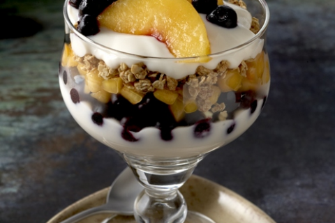 Layer one-half granola, yogurt and fruit in parfait glass. Repeat layers. Garnish with mint.